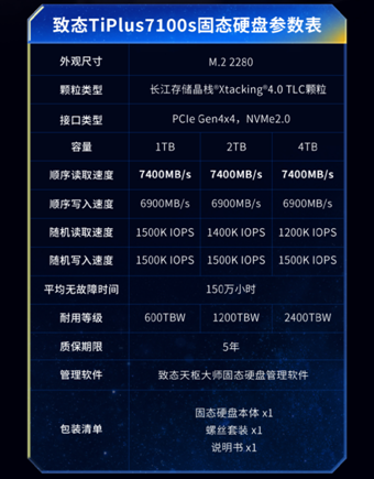 致态自成立以来,将用户需求作为发展的原动力,以技术创新作为产品的根本保障,持续为市场带来高性能、高品质的多元化存储解决方案,为消费者带来不同凡响的存储使用体验。致态TiPlus7100s正是这一品牌理念的卓越实践,其出色产品实力,必将成为各位游戏玩家以及DIY用户的不二之选。